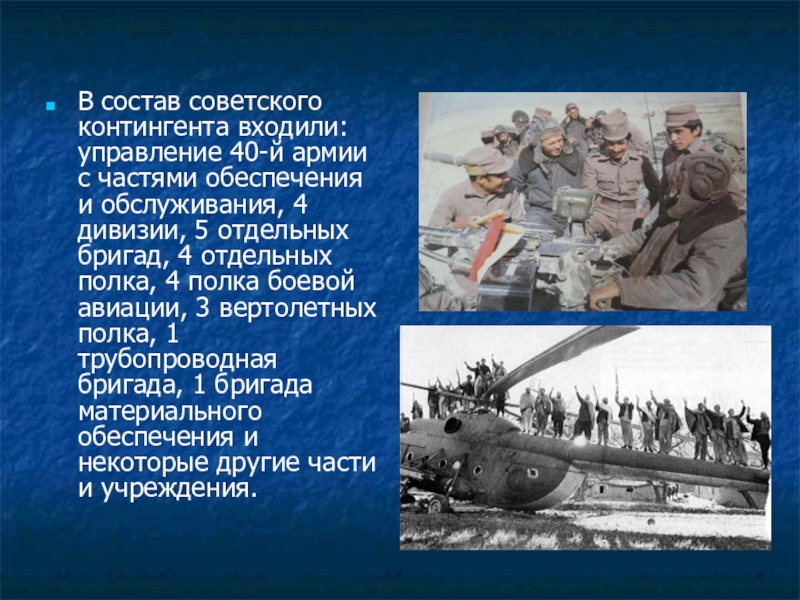 В состав советского контингента входили: управление 40-й армии с частями обеспечения