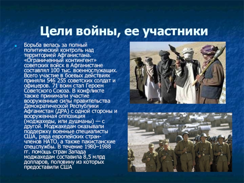 территорией Афганистана. «Ограниченный контингент» советских войск в Афганистане составлял 100 тыс. военнослужащих. Всего участие в боевых действиях приняли 546 255 советских солдат и офицеров. 71 воин стал Героем Советского Союза. В конфликте также принимали участие вооруженные силы правительства Демократической Республики Афганистан (ДРА) с одной стороны и вооруженная оппозиция (моджахеды, или душманы) — с другой. Моджахедам оказывали поддержку военные специалисты США, ряда европейских стран-членов НАТО, а также пакистанские спецслужбы. В течение 1980–1988 гг. помощь стран Запада моджахедам составила 8,5 млрд долларов, половину из которых предоставили США