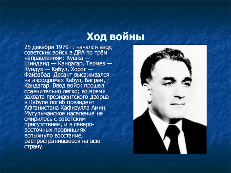 25 декабря 1979 г. начался ввод советских войск в ДРА по трём направлениям: Кушка — Шинданд — Кандагар, Термез — Кундуз — Кабул, Хорог — Файзабад. Десант высаживался на аэродромах Кабул, Баграм, Кандагар. Ввод войск прошел сравнительно легко; во время захвата президентского дворца в Кабуле погиб президент Афганистана Хафизулла Амин. Мусульманское население не смирилось с советским присутствием, и в северо-восточных провинциях вспыхнуло восстание, распространившееся на всю страну.