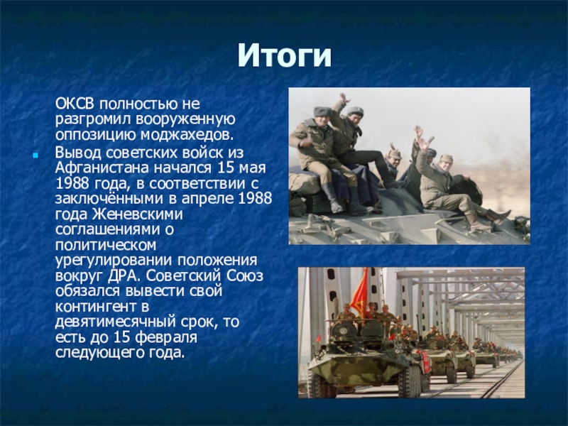 Вывод советских войск из Афганистана начался 15 мая 1988 года, в соответствии с заключёнными в апреле 1988 года Женевскими соглашениями о политическом урегулировании положения вокруг ДРА. Советский Союз обязался вывести свой контингент в девятимесячный срок, то есть до 15 февраля следующего года.