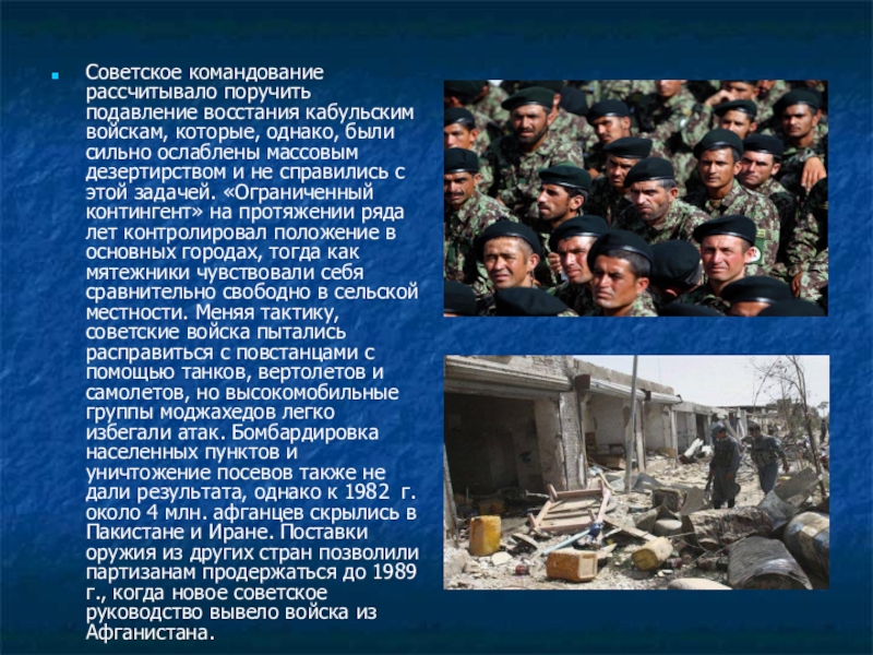 сильно ослаблены массовым дезертирством и не справились с этой задачей. «Ограниченный контингент» на протяжении ряда лет контролировал положение в основных городах, тогда как мятежники чувствовали себя сравнительно свободно в сельской местности. Меняя тактику, советские войска пытались расправиться с повстанцами с помощью танков, вертолетов и самолетов, но высокомобильные группы моджахедов легко избегали атак. Бомбардировка населенных пунктов и уничтожение посевов также не дали результата, однако к 1982 г. около 4 млн. афганцев скрылись в Пакистане и Иране. Поставки оружия из других стран позволили партизанам продержаться до 1989 г., когда новое советское руководство вывело войска из Афганистана.