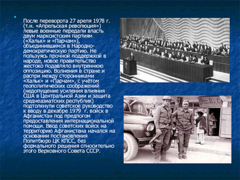 После переворота 27 ареля 1978 г. (т.н. «Апрельская революция») левые военные передали власть двум марксистским партиям («Хальк» и «Парчам»), объединившимся в Народно-демократическую партию. Не пользуясь прочной поддержкой в народе, новое правительство жестоко подавляло внутреннюю оппозицию. Волнения в стране и распри между сторонниками «Хальк» и «Парчам», с учётом геополитических соображений (недопущение усиления влияния США в Центральной Азии и защита среднеазиатских республик) подтолкнули советское руководство к вводу в декабре 1979 г. войск в Афганистан под предлогом предоставления интернациональной помощи. Ввод советских войск на территорию Афганистана начался на основании постановления Политбюро ЦК КПСС, без формального решения относительно этого Верховного Совета СССР.