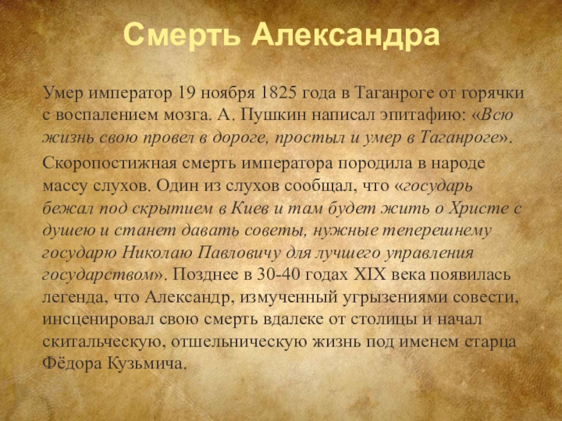 Скоропостижная смерть императора породила в народе массу слухов. Один из слухов сообщал, что «государь бежал под скрытием в Киев и там будет жить о Христе с душею и станет давать советы, нужные теперешнему государю Николаю Павловичу для лучшего управления государством». Позднее в 30-40 годах XIX века появилась легенда, что Александр, измученный угрызениями совести, инсценировал свою смерть вдалеке от столицы и начал скитальческую, отшельническую жизнь под именем старца Фёдора Кузьмича.