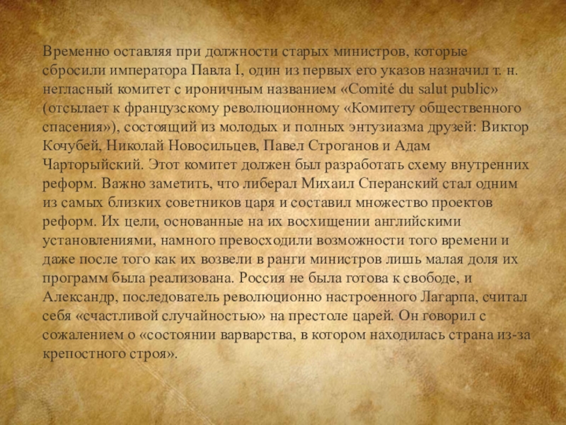 один из первых его указов назначил т. н. негласный комитет с ироничным названием «Comité du salut public» (отсылает к французскому революционному «Комитету общественного спасения»), состоящий из молодых и полных энтузиазма друзей: Виктор Кочубей, Николай Новосильцев, Павел Строганов и Адам Чарторыйский. Этот комитет должен был разработать схему внутренних реформ. Важно заметить, что либерал Михаил Сперанский стал одним из самых близких советников царя и составил множество проектов реформ. Их цели, основанные на их восхищении английскими установлениями, намного превосходили возможности того времени и даже после того как их возвели в ранги министров лишь малая доля их программ была реализована. Россия не была готова к свободе, и Александр, последователь революционно настроенного Лагарпа, считал себя «счастливой случайностью» на престоле царей. Он говорил с сожалением о «состоянии варварства, в котором находилась страна из-за крепостного строя».