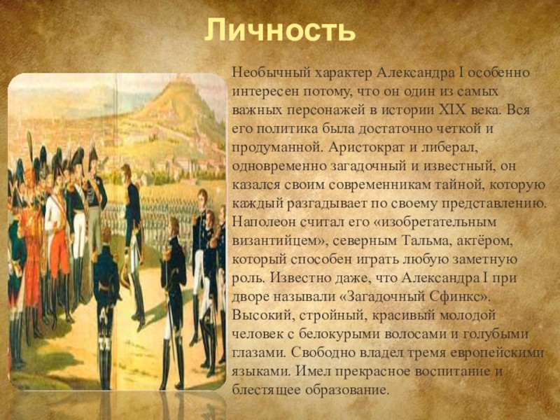 самых важных персонажей в истории XIX века. Вся его политика была достаточно четкой и продуманной. Аристократ и либерал, одновременно загадочный и известный, он казался своим современникам тайной, которую каждый разгадывает по своему представлению. Наполеон считал его «изобретательным византийцем», северным Тальма, актёром, который способен играть любую заметную роль. Известно даже, что Александра I при дворе называли «Загадочный Сфинкс». Высокий, стройный, красивый молодой человек с белокурыми волосами и голубыми глазами. Свободно владел тремя европейскими языками. Имел прекрасное воспитание и блестящее образование.