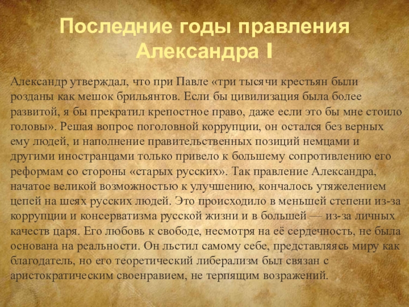 крестьян были розданы как мешок брильянтов. Если бы цивилизация была более развитой, я бы прекратил крепостное право, даже если это бы мне стоило головы». Решая вопрос поголовной коррупции, он остался без верных ему людей, и наполнение правительственных позиций немцами и другими иностранцами только привело к большему сопротивлению его реформам со стороны «старых русских». Так правление Александра, начатое великой возможностью к улучшению, кончалось утяжелением цепей на шеях русских людей. Это происходило в меньшей степени из-за коррупции и консерватизма русской жизни и в большей — из-за личных качеств царя. Его любовь к свободе, несмотря на её сердечность, не была основана на реальности. Он льстил самому себе, представляясь миру как благодатель, но его теоретический либерализм был связан с аристократическим своенравием, не терпящим возражений.