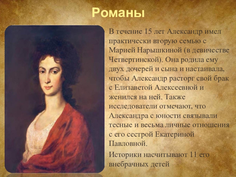 Нарышкиной (в девичестве Четвертинской). Она родила ему двух дочерей и сына и настаивала, чтобы Александр расторг свой брак с Елизаветой Алексеевной и женился на ней. Также исследователи отмечают, что Александра с юности связывали тесные и весьма личные отношения с его сестрой Екатериной Павловной.