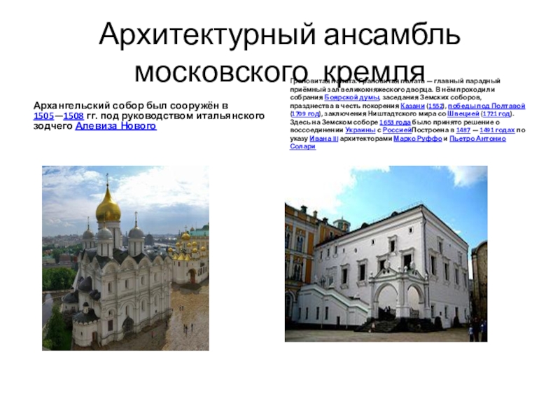 Грановитая палата. Грановитая палата — главный парадный приёмный зал великокняжеского дворца. В нём проходили собрания Боярской думы, заседания Земских соборов, празднества в честь покорения Казани (1552), победы под Полтавой (1709 год), заключения Ништадтского мира со Швецией (1721 год). Здесь на Земском соборе 1653 года было принято решение о воссоединении Украины с РоссиейПостроена в 1487 — 1491 годах по указу Ивана III архитекторами Марко Руффо и Пьетро Антонио Солари