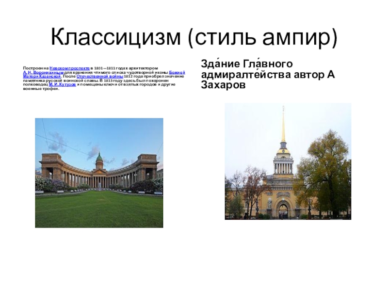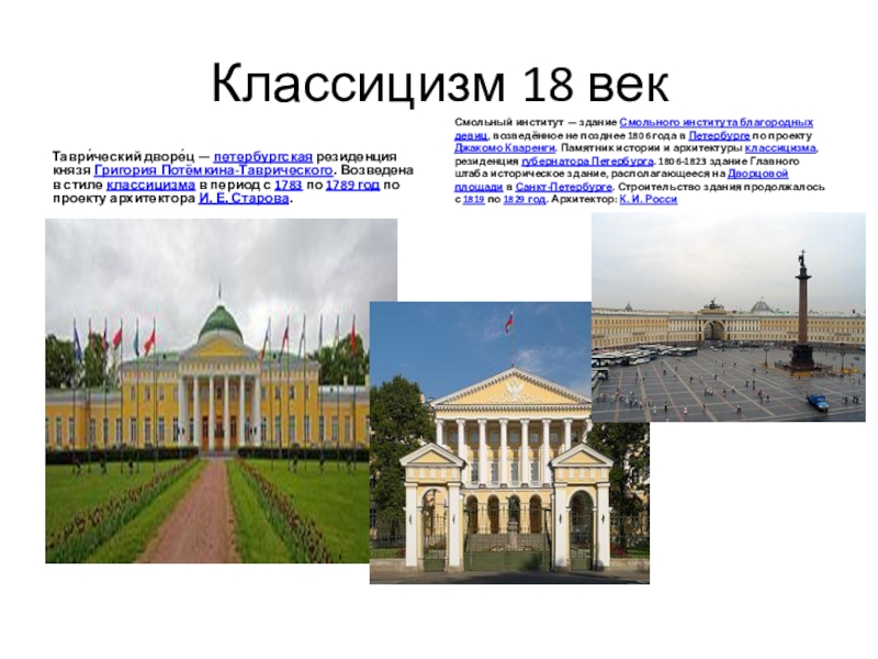 Смольный институт — здание Смольного института благородных девиц, возведённое не позднее 1806 года в Петербурге по проекту Джакомо Кваренги. Памятник истории и архитектуры классицизма, резиденция губернатора Петербурга. 1806-1823 здание Главного штаба историческое здание, располагающееся на Дворцовой площади в Санкт-Петербурге. Строительство здания продолжалось с 1819 по 1829 год. Архитектор: К. И. Росси