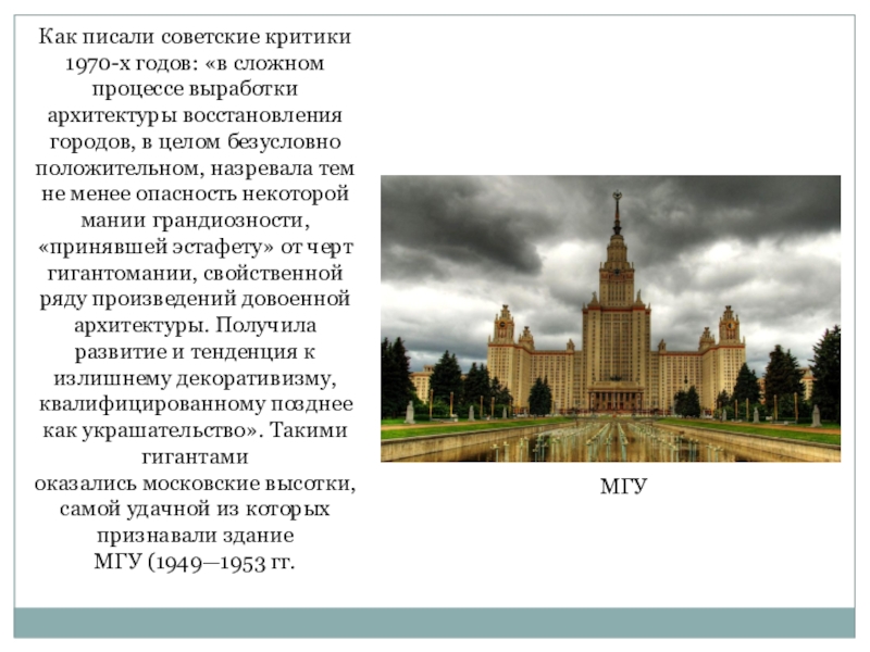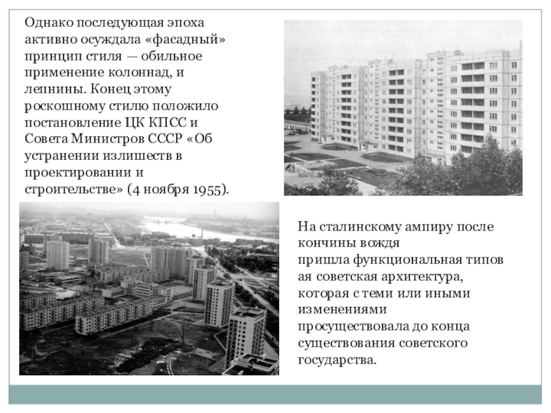 На сталинскому ампиру после кончины вождя пришла функциональная типовая советская архитектура, которая с теми или иными изменениями просуществовала до конца существования советского государства.