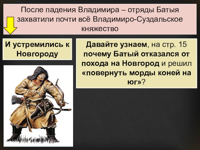 Давайте узнаем, на стр. 15 почему Батый отказался от похода на Новгород и решил «повернуть морды коней на юг»?