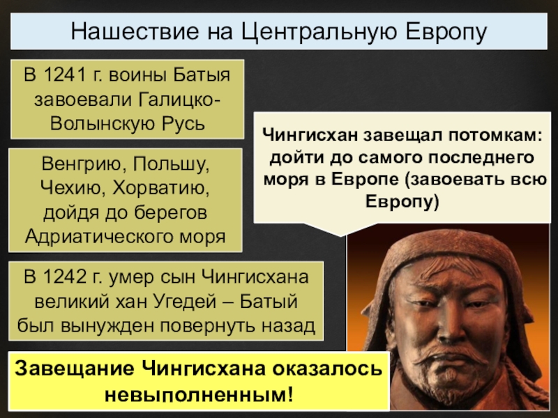 В 1242 г. умер сын Чингисхана великий хан Угедей – Батый был вынужден повернуть назад