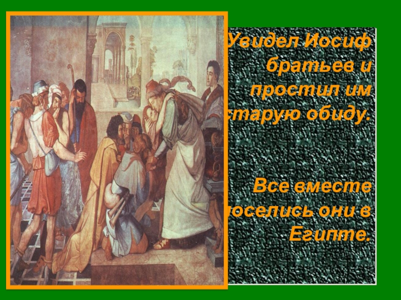 Слайд 15Увидел Иосиф братьев и простил им старую обиду. Все вместе поселись они