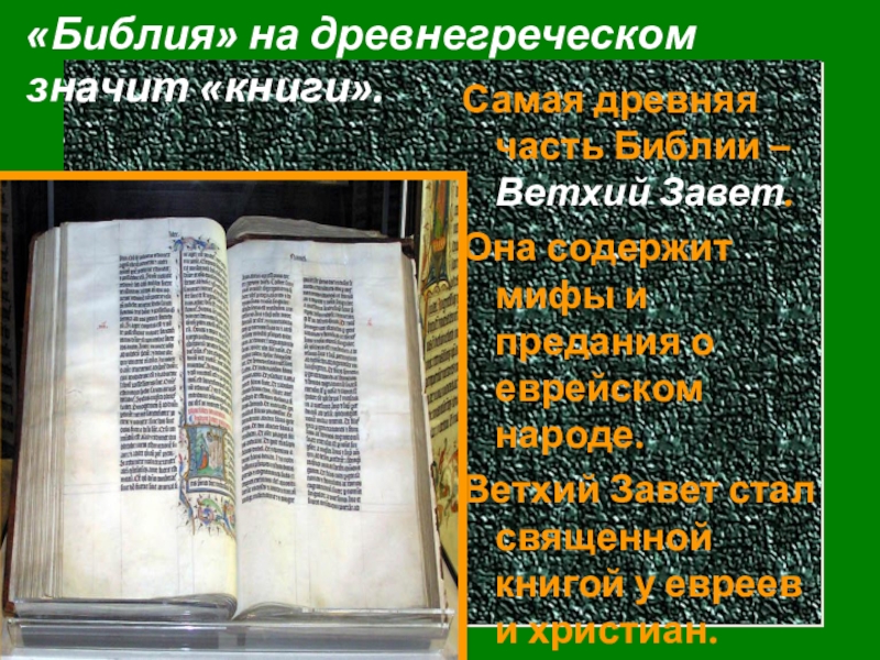 «Библия» на древнегреческом значит «книги».Самая древняя часть Библии – Ветхий Завет.Она содержит мифы и предания о еврейском
