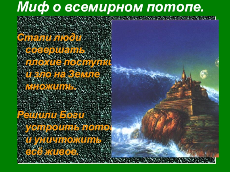 Миф о всемирном потопе.Стали люди совершать плохие поступки и зло на Земле множить. Решили Боги устроить потоп