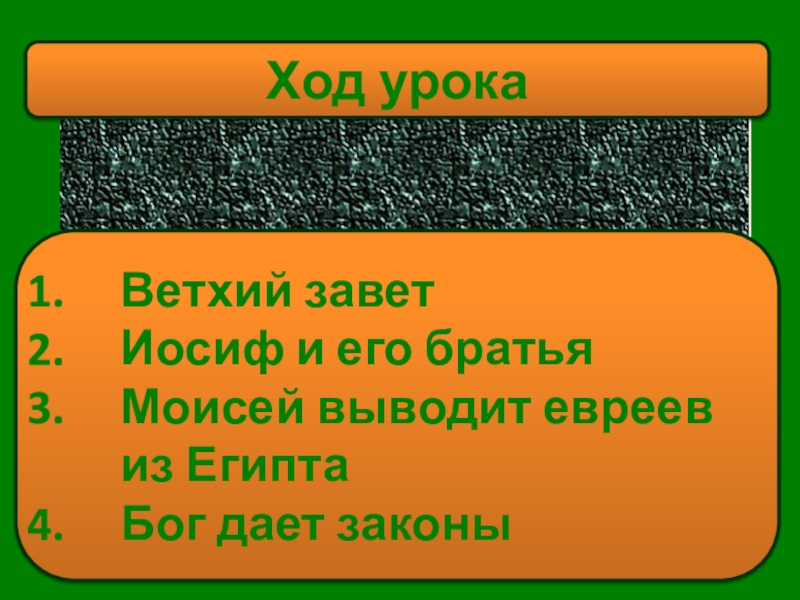 Ход урокаВетхий заветИосиф и его братьяМоисей выводит евреев из ЕгиптаБог дает законы