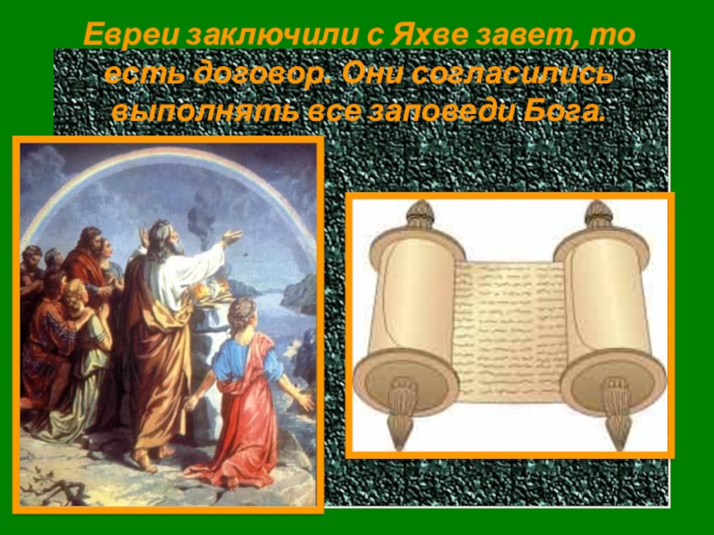 Слайд 19Евреи заключили с Яхве завет, то есть договор. Они согласились выполнять