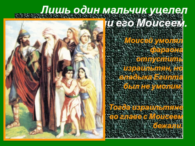 Лишь один мальчик уцелел назвали его Моисеем.Моисей умолял фараона отпустить израильтян, но владыка Египта был не умолим.Тогда