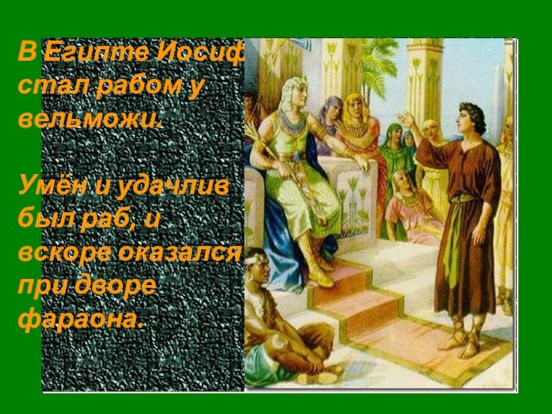 Слайд 14В Египте Иосиф стал рабом у вельможи. Умён и удачлив был