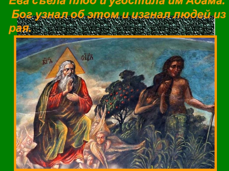 Ева съела плод и угостила им Адама. Бог узнал об этом и изгнал людей из рая.