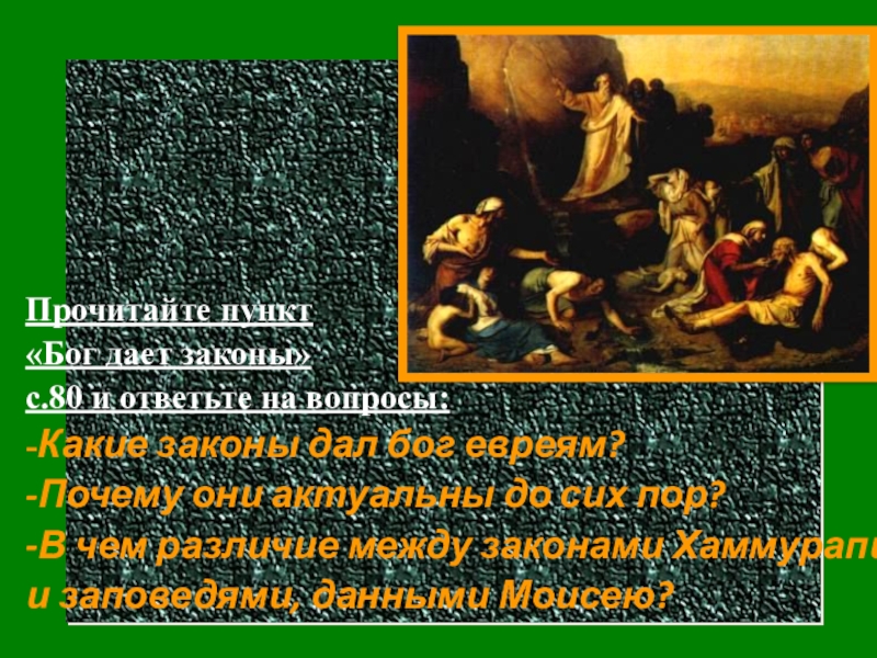 Прочитайте пункт «Бог дает законы» с.80 и ответьте на вопросы:-Какие законы дал бог евреям?-Почему они актуальны до