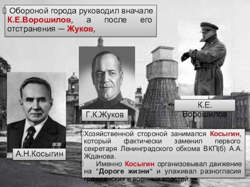 Обороной города руководил вначале К.Е.Ворошилов, а после его отстранения — Жуков,