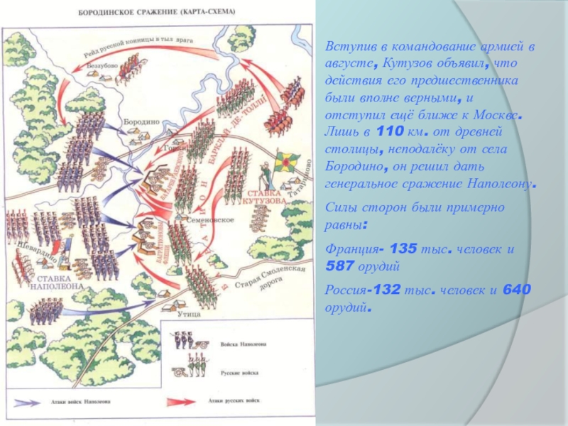 предшественника были вполне верными, и отступил ещё ближе к Москве. Лишь в 110 км. от древней столицы, неподалёку от села Бородино, он решил дать генеральное сражение Наполеону.