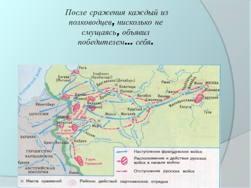 удалось сломить сопротивление русских; во-вторых, русская армия вывела из строя существенную часть армии противника; в-третьих, на Бородинском поле французская армия понесла невосполнимое моральное поражение.