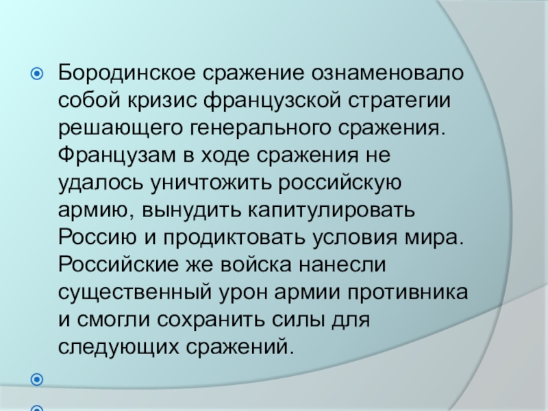 Слайд 20Бородинское сражение ознаменовало собой кризис французской стратегии решающего генерального сражения. Французам
