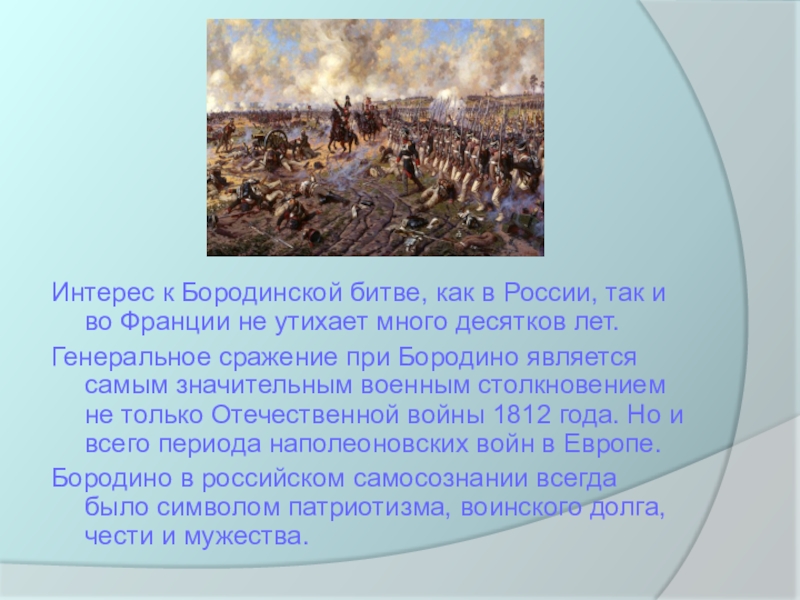 Слайд 5Интерес к Бородинской битве, как в России, так и во Франции