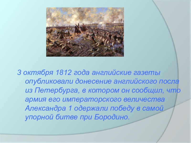 Петербурга, в котором он сообщил, что армия его императорского величества Александра 1 одержали победу в самой упорной битве при Бородино.
