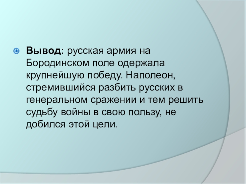 Слайд 22Вывод: русская армия на Бородинском поле одержала крупнейшую победу. Наполеон, стремившийся