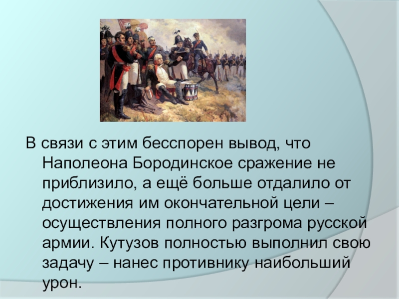 Слайд 18В связи с этим бесспорен вывод, что Наполеона Бородинское сражение не