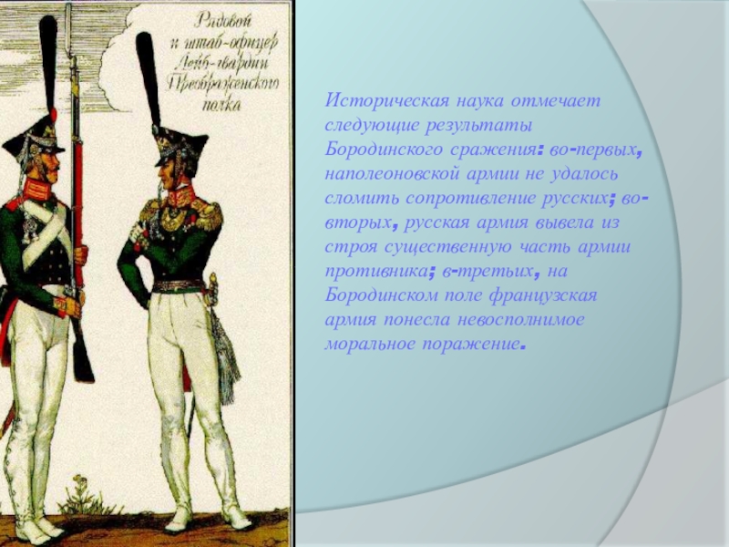 Историческая наука отмечает следующие результаты Бородинского сражения: во-первых, наполеоновской армии не