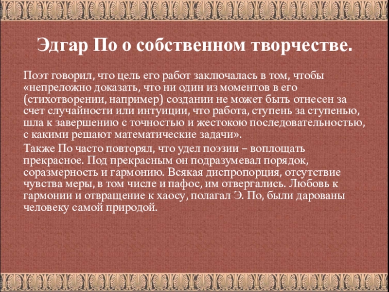Также По часто повторял, что удел поэзии – воплощать прекрасное. Под прекрасным он подразумевал порядок, соразмерность и гармонию. Всякая диспропорция, отсутствие чувства меры, в том числе и пафос, им отвергались. Любовь к гармонии и отвращение к хаосу, полагал Э. По, были дарованы человеку самой природой.