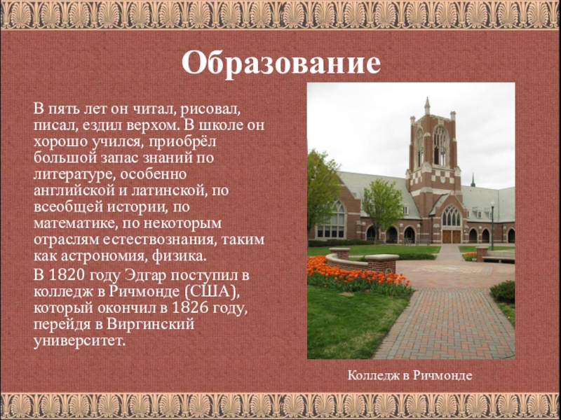 В 1820 году Эдгар поступил в колледж в Ричмонде (США), который окончил в 1826 году, перейдя в Виргинский университет.