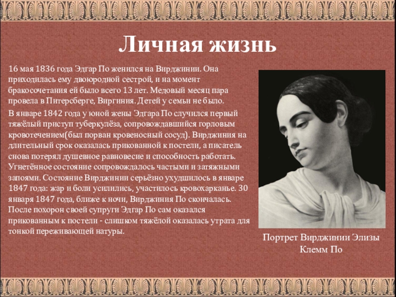 16 мая 1836 года Эдгар По женился на Вирджинии. Она