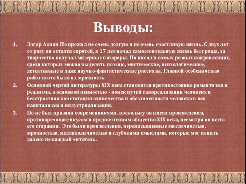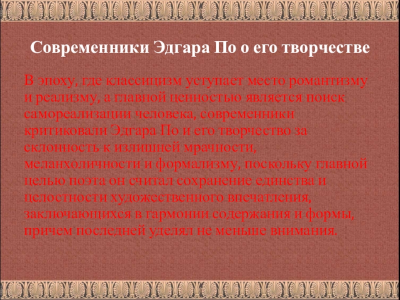 романтизму и реализму, а главной ценностью является поиск самореализации человека, современники критиковали Эдгара По и его творчество за склонность к излишней мрачности, меланхоличности и формализму, поскольку главной целью поэта он считал сохранение единства и целостности художественного впечатления, заключающихся в гармонии содержания и формы, причем последней уделял не меньше внимания.