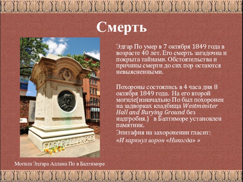 Эдгар По умер в 7 октября 1849 года в возрасте 40
