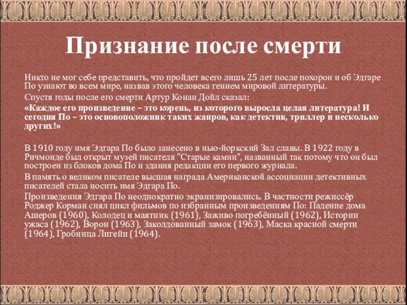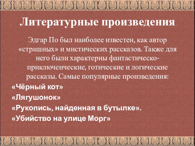 рассказов. Также для него были характерны фантастическо-приключенческие, готические и логические рассказы. Самые популярные произведения: