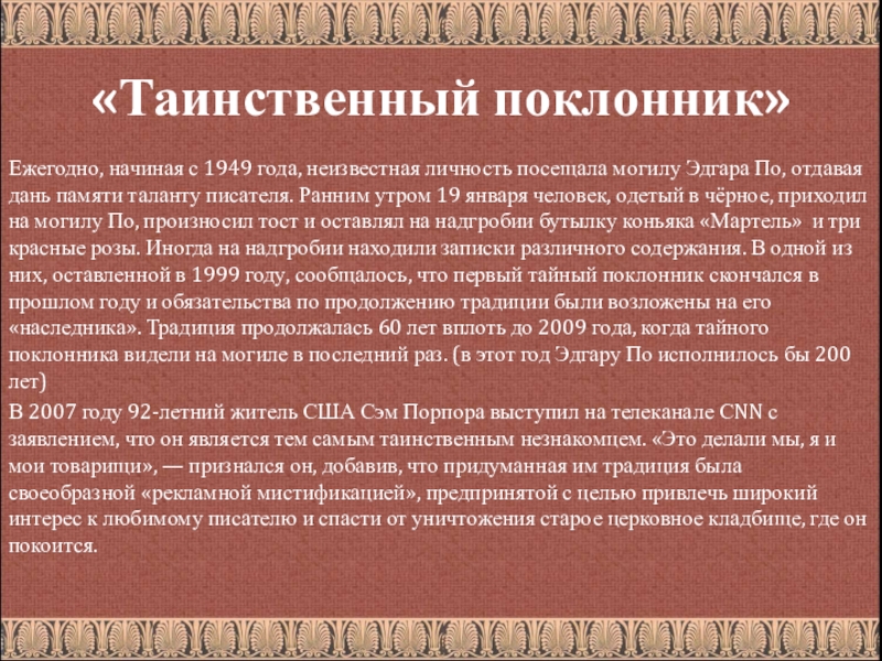 По, отдавая дань памяти таланту писателя. Ранним утром 19 января человек, одетый в чёрное, приходил на могилу По, произносил тост и оставлял на надгробии бутылку коньяка «Мартель» и три красные розы. Иногда на надгробии находили записки различного содержания. В одной из них, оставленной в 1999 году, сообщалось, что первый тайный поклонник скончался в прошлом году и обязательства по продолжению традиции были возложены на его «наследника». Традиция продолжалась 60 лет вплоть до 2009 года, когда тайного поклонника видели на могиле в последний раз. (в этот год Эдгару По исполнилось бы 200 лет)