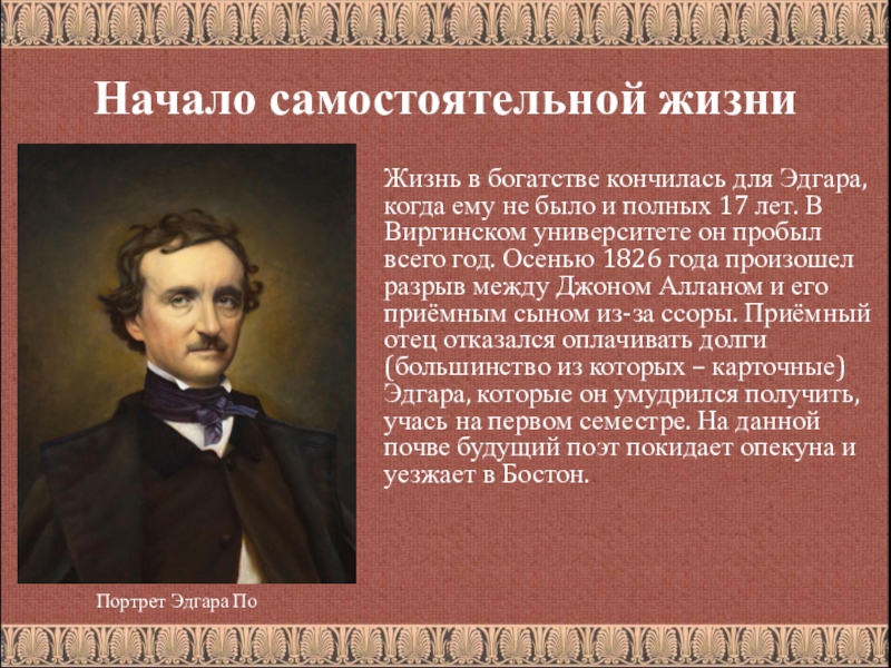 было и полных 17 лет. В Виргинском университете он пробыл всего год. Осенью 1826 года произошел разрыв между Джоном Алланом и его приёмным сыном из-за ссоры. Приёмный отец отказался оплачивать долги (большинство из которых – карточные) Эдгара, которые он умудрился получить, учась на первом семестре. На данной почве будущий поэт покидает опекуна и уезжает в Бостон.