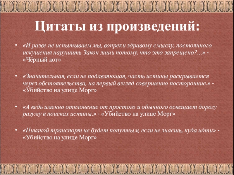 «А ведь именно отклонение от простого и обычного освещает дорогу разуму в поисках истины.» - «Убийство на улице Морг»