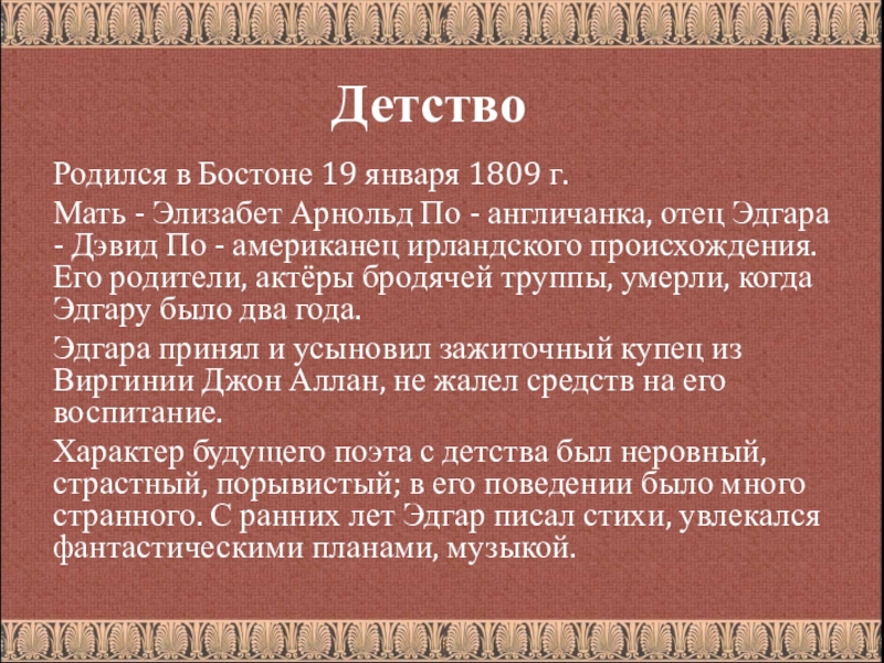 - англичанка, отец Эдгара - Дэвид По - американец ирландского происхождения. Его родители, актёры бродячей труппы, умерли, когда Эдгару было два года.