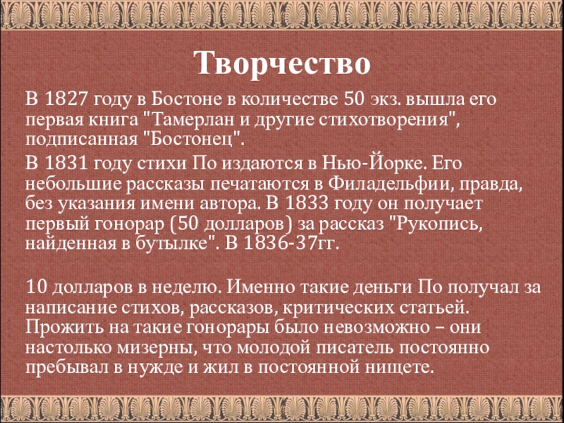 10 долларов в неделю. Именно такие деньги По получал за написание стихов, рассказов, критических статьей. Прожить на такие гонорары было невозможно – они настолько мизерны, что молодой писатель постоянно пребывал в нужде и жил в постоянной нищете.