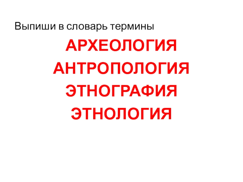 Выпиши в словарь терминыАРХЕОЛОГИЯ АНТРОПОЛОГИЯЭТНОГРАФИЯЭТНОЛОГИЯ