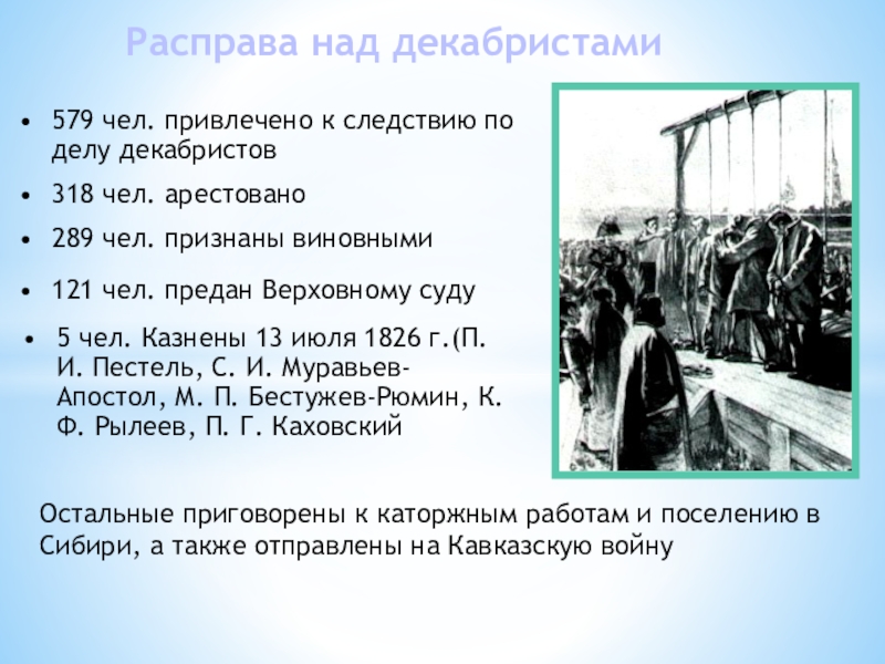 5 чел. Казнены 13 июля 1826 г.(П. И. Пестель, С. И. Муравьев-Апостол, М. П. Бестужев-Рюмин, К. Ф. Рылеев, П. Г. Каховский