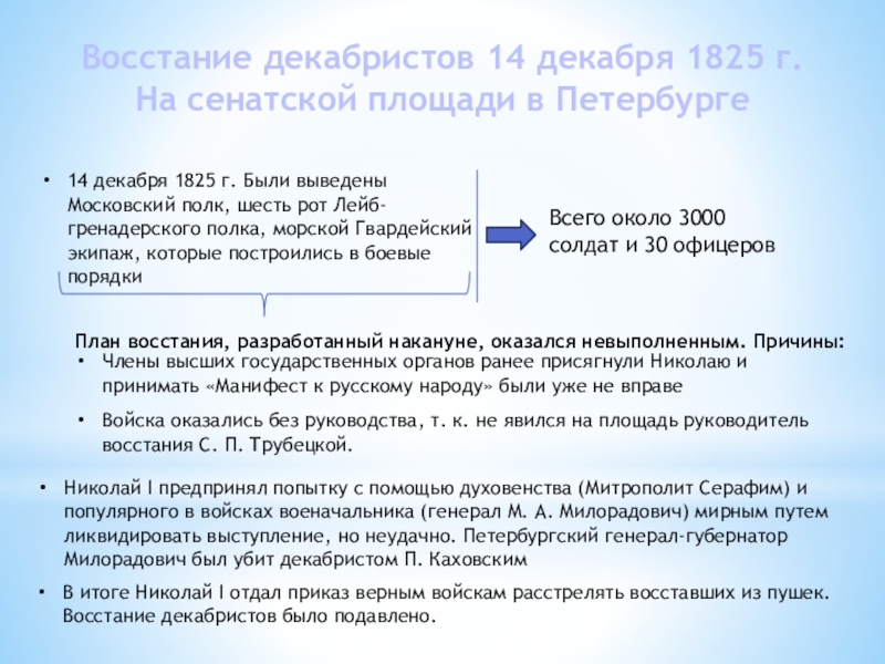 Войска оказались без руководства, т. к. не явился на площадь руководитель восстания С. П. Трубецкой.