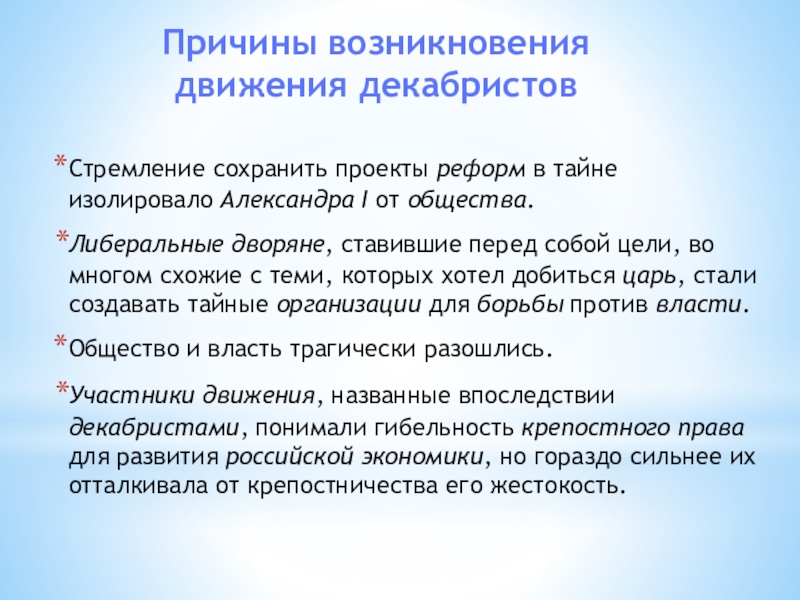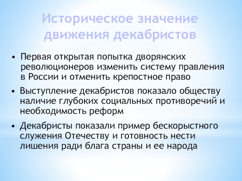 Выступление декабристов показало обществу наличие глубоких социальных противоречий и необходимость реформ