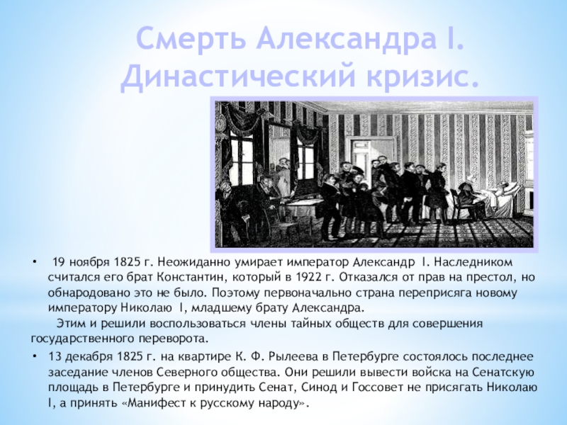 13 декабря 1825 г. на квартире К. Ф. Рылеева в Петербурге состоялось последнее заседание членов Северного общества. Они решили вывести войска на Сенатскую площадь в Петербурге и принудить Сенат, Синод и Госсовет не присягать Николаю I, а принять «Манифест к русскому народу».
